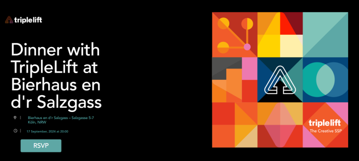TripleLift está organizando una cena especial en Bierhaus en d’r Salzgass para dar inicio a DMEXCO 2024. Esta noche promete comida deliciosa, buena compañía y conversaciones interesantes en un ambiente relajado. Es la manera ideal de comenzar la conferencia, reuniendo a profesionales de la industria para una noche de celebración y networking.